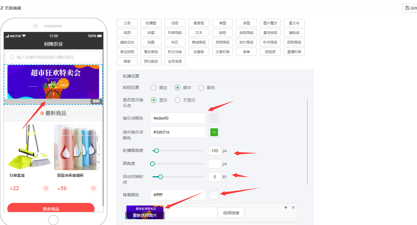 比如需要更換輪播圖,鼠標(biāo)點(diǎn)中它,左邊的上傳圖片 就可以傳新的圖片,同時可以設(shè)置連接,和大小,樣式