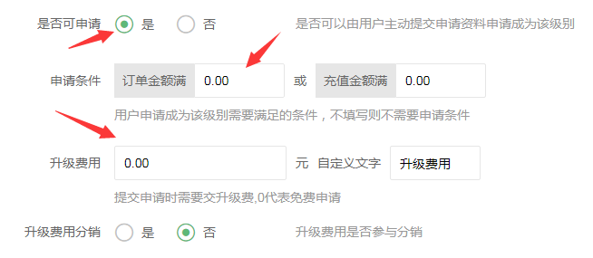 編輯分銷會員,這里就是申請升級的條件,可以滿多少金額,或者直接收費(fèi)升級
