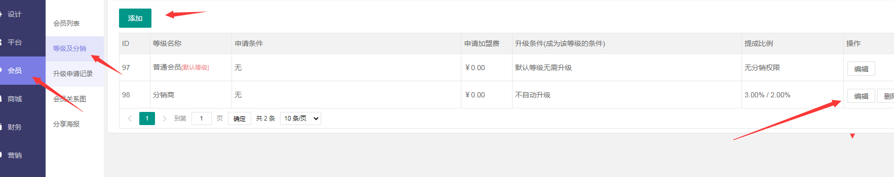 然后是會員管理,和等級分銷,可以直接編輯默認(rèn)的分銷設(shè)置,也可以添加更多的會員等級,進(jìn)行升級的條件設(shè)置。