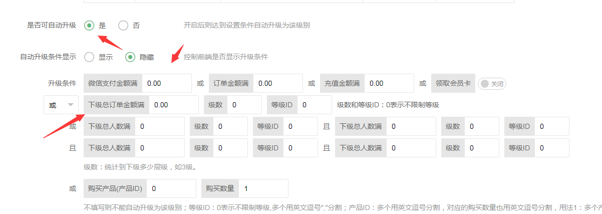 如果有多個會員等級,可以設(shè)置自動升級的條件,比如消費(fèi)滿多少,下級消費(fèi)滿多少,或者拉了多少個哪個等級的下級,才能自動升級