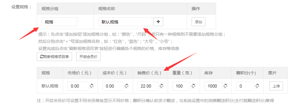規(guī)格根據(jù)自己需要設(shè)置,名字和規(guī)格參數(shù),也可以不設(shè)置,直接下面銷售價填寫價格