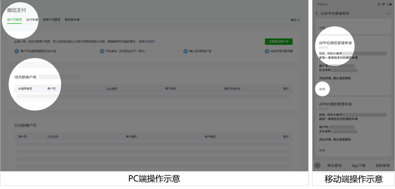 小程序:前往公眾平臺(mp.weixin.qq.com),點擊“微信支付-商戶號管理”,查看相關商戶號信息,確認授權申請,或在“公眾平臺安全助手”下發的模板消息中確認授權信息;